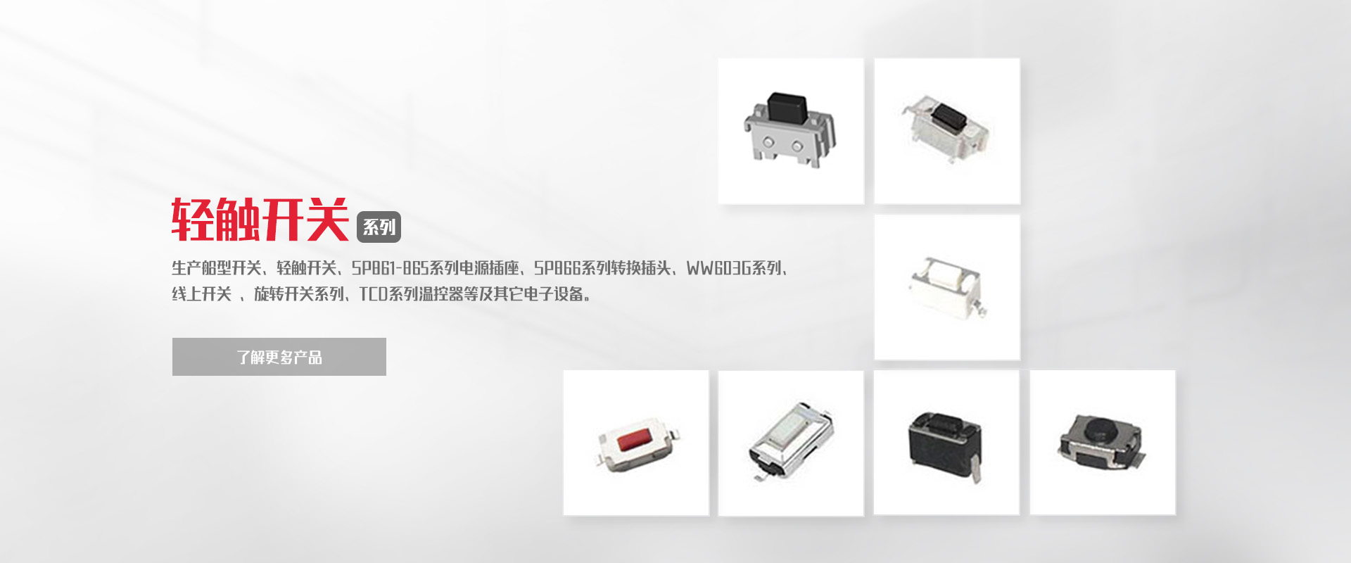 公司專業(yè)生產船型開關、輕觸開關、SP861-865系列電源插座、SP866系列轉換插頭、WW11系列微動開關、WW01-03、09系列按鈕開關DS、WW系列指示燈開關、WW603G系列 線上開關 、旋轉開關系列、TCD系列溫控器等及其它電子設備。